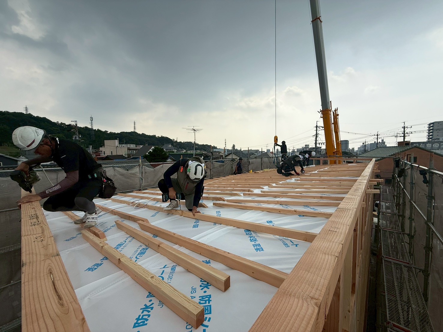 上棟後、まず優先的に行うのが屋根工事です。建物内部を雨から守るため、できるだけ早く屋根を仕上げることが重要です。